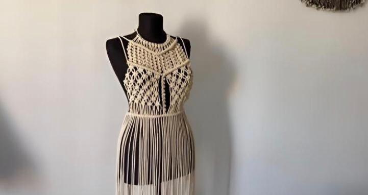 لباس بلند مکرومه با نخ‌های رنگی و طراحی کلاسیک، مناسب برای استایل خاص.