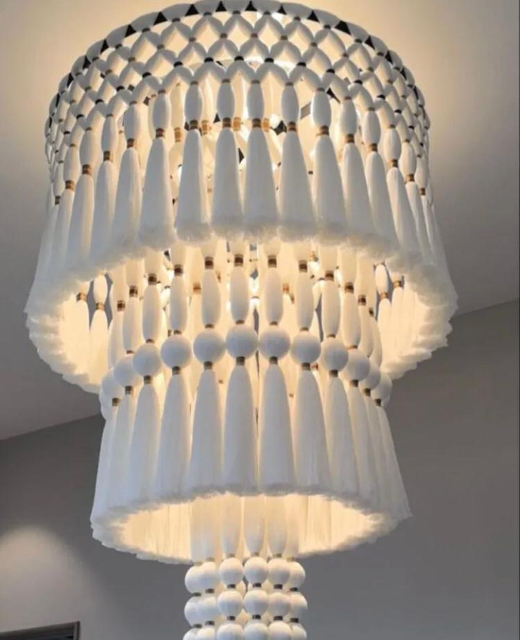 لوستر چندطبقه مکرومه با نخ سفید، طراحی دستباف و خاص برای فضای مینیمال.